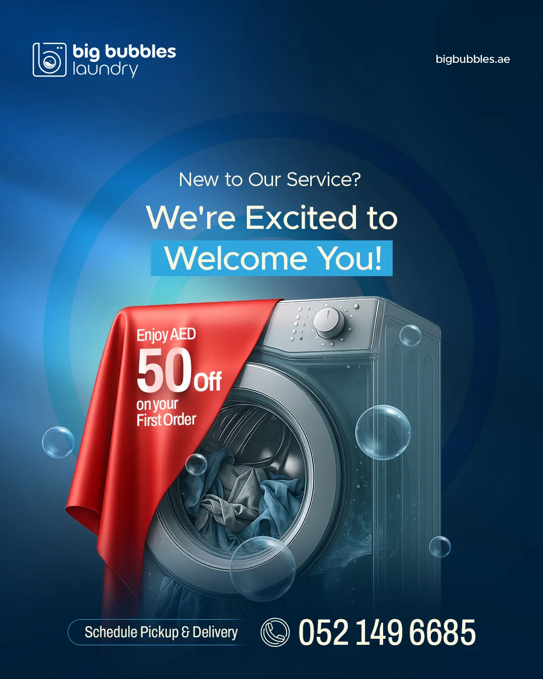 Enjoy premium laundry in Dubai with Big Bubbles. We offer free pickup and delivery across the city, so when you search for laundry near me, fresh and clean clothes are always close to you. Our team delivers reliable laundry and dry cleaning services in Jumeirah, Dubai Marina, JBR, JLT and across Dubai.